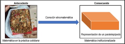 En este artículo se exploraron las conexiones etnomatemáticas en la elaboración de arroz chino en el sur del departamento del Atlántico con el propósito de contribuir en la enseñanzaaprendizaje de las matemáticas, en efecto, es un estudio que presenta novedades en el campo de la investigación en la Educación Matemática ya que antes no se había realizado en la parte gastronómica del arroz chino, sino investigaciones centradas en la gastronomía y matemáticas pero enfatizando en las formas de la tortilla, piononos, trompos de carne, tacos, entre otros (AGULLÓ et al., 2014; BUSRAH & PATHUDDIN, 2021; MUÑOZ et al., 2022; RODRÍGUEZ-NIETO et al., 2022a, 2022b). Otra conexión etnomatemática se establece entre la forma de la caja y la representación del paralelepípedo (Figura 9).