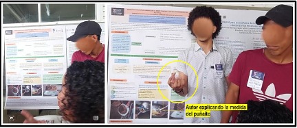 Este trabajo de investigación fue presentado en una feria sobre Didáctica de las matemáticas con el objetivo de contribuir a la enseñanza y aprendizaje de las matemáticas desde un enfoque sociocultural. En dicha feria participaron estudiantes de bachillerato y universitarios, quienes fueron acompañados por sus profesores titulares para dialogar entorno a los proyectos. Especialmente las matemáticas evidenciadas en la elaboración del arroz chino, captó la atención de la mayoría de los estudiantes dado que es un plato apetecedor y que requiere de varios ingredientes y dedicación. En la Figura 10 y en el extracto de la transcripción se muestran a los autores socializando su trabajo.