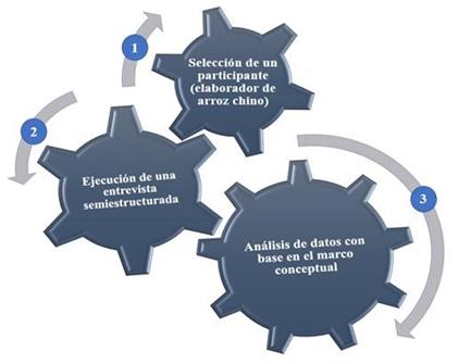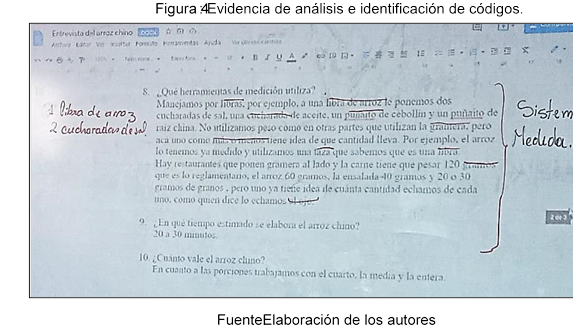 Posteriormente, se aplicó una entrevista semiestructurada (Hernández et al., 2014) al cocinero durante el trabajo de campo (ver Figura 3), donde se hicieron preguntas, por ejemplo: ¿Cómo se elabora el arroz chino? ¿Qué ingredientes utiliza para la elaboración de arroz chino? ¿Cuáles son los pasos para hacer el arroz chino? ¿Qué herramientas de medición utiliza?, entre otras, con el fin de profundizar sobre su práctica cotidiana. Durante la entrevista se usaron cámaras fotográficas, notas de campo y grabadora de audio.