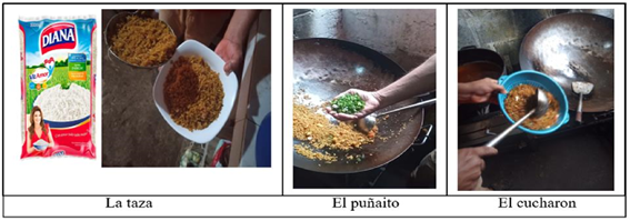 I2: Podemos encontrar las medidas convencionales y las no convencionales. Para la elaboración del arroz chino utilizan la taza, que una taza equivale a una libra arroz, el puñadito que son 20 gramos aproximadamente… dos cucharones para despachar lo que equivale a un cuarto de arroz, tres cucharones un medio y cuatro un entero.