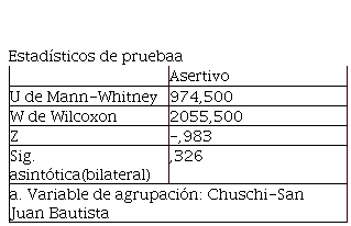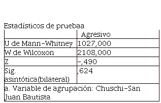 La prueba de U de Mann-Whitney permite probar la diferencia del estilo agresivo en los docentes de las instituciones educativas públicas de los distritos de Chuschi y San Juan Bautista, Ayacucho-2020. De acuerdo al nivel de significancia, el valor obtenido es equivalente a 0,624, que es mayor a 0,05, resultado que permite rechazar la hipótesis alterna y aceptar la nula. Concluyendo que, a un nivel de confianza de 95%, no son muy diferenciados.