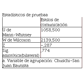 La prueba de U de Mann-Whitney permite probar la diferencia de los estilos de comunicación en los docentes de las instituciones educativas públicas de los distritos de Chuschi y San Juan Bautista, Ayacucho-2020. De acuerdo al nivel de significancia, el valor obtenido es equivalente a 0,774, que es mayor a 0,05, resultado que permite rechazar la hipótesis alterna y aceptar la nula. Concluyendo que, a un nivel de confianza de 95%, no son muy diferenciados.