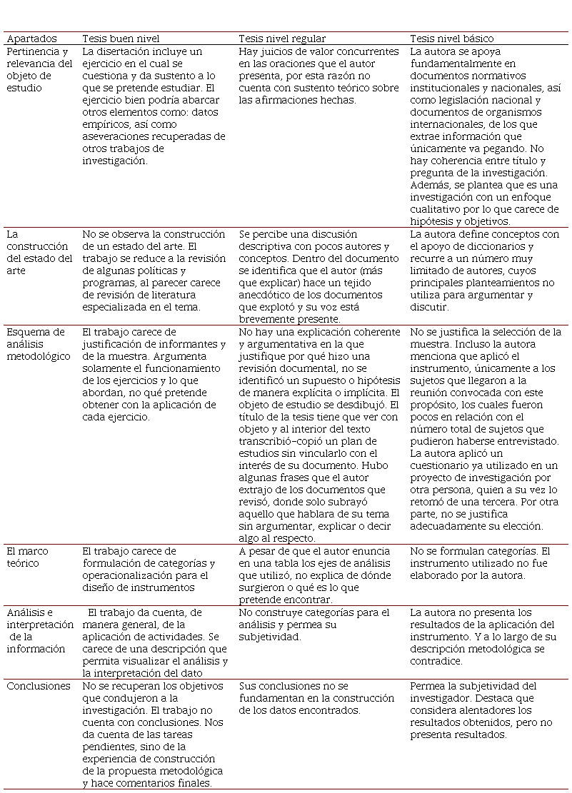 El análisis de los datos y el proceso de revisión, reflexión, cruce de información y categorías teóricas nos llevaron a clarificar tres tipos de tesis en el uso y la apropiación de la teoría, y por consiguiente tres criterios de demarcación: 1) tesis con un buen manejo y dominio de la teoría, 2) tesis con un manejo y dominio regular de la teoría y 3) tesis con un manejo y dominio mínimo básico de la teoría. Así, las tesis de posgrado, como documentos exclusivos, se convirtieron en el segundo material por analizar.