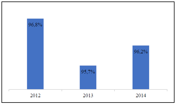 Internet access in manufacturing companies has remained constant during 2012-2014. The percentage of the total number of companies with an Internet connection was 96.8% (2012), 95.7% (2013) and 96.2% (2014) (Figure 5). On the other hand, the distribution of manufacturing firms that access to Internet according to their size is: 42.8% (big companies), 22.9% (medium B firms), 21.5% (small companies), 6.9% (medium A firms) and 2.1% (microenterprise) in 2014.