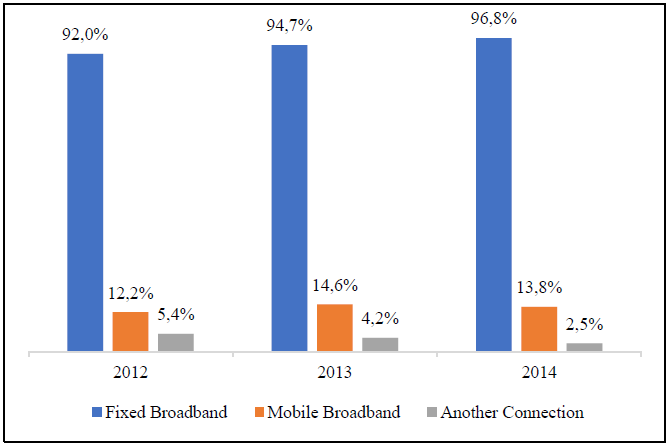 In the manufacturing companies (with Internet access), the most widely used type of Internet connection (companies can use several types of connection, the answer is not exclusive) is the fixed broadband with an average of 94.5% during 2012-2014, while 13.5% of firms work with mobile broadband and 4.0% with another type of connection (includes narrow band) (Figure 6).