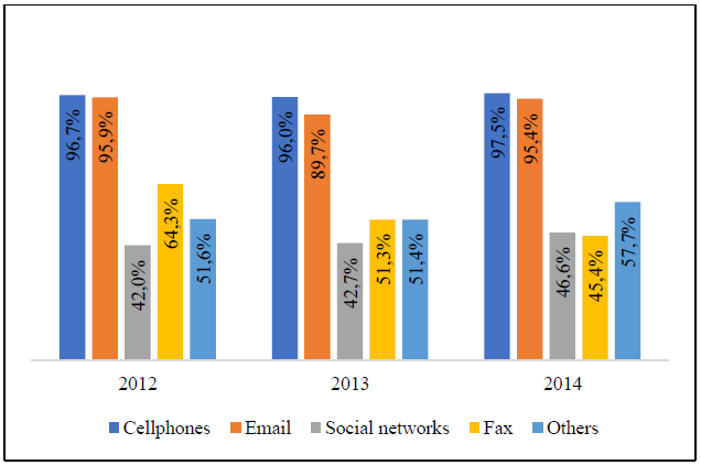 Most of the manufacturing surveyed companies employed cellphones and emails as media for their businesses (companies can have several types of media, the answer is not exclusive, and the “Others” category includes: specialized messaging, call center, virtual mailboxes and unified communications). For example, in 2012, 96.7% and 95.9% of the manufacturing companies used these categories as communication channels, while during 2014, these percentages changed to 97.5% and 95.4%, respectively (Figure 8).