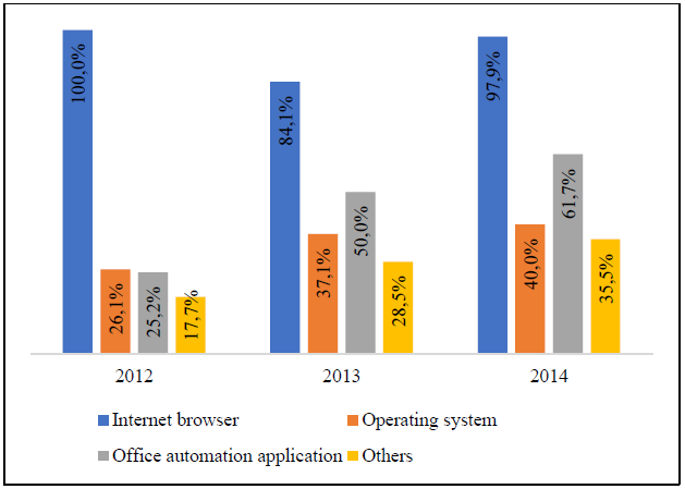 In 2012, all the manufacturing companies (with Internet access) used Internet browsers -the most popular free browsers are: Mozilla Firefox, Opera, Google Chrome, and Netscape- while 26.1% of them employed operating systems -the most popular operating systems are: GNU/Linux, GNU/Hurd, GNU/Darwin, OpenBSD, FreeBSD, NetBSD, and SO3-, 25.2% office automation application (Open Office) and 17.7% other kind of open source software (includes open source application and software security). During 2014, it is evident that the categories of operating system, office automation application and others showed a rapid increase to 40.0%, 61.7% and 35.5%, respectively (Figure 9).