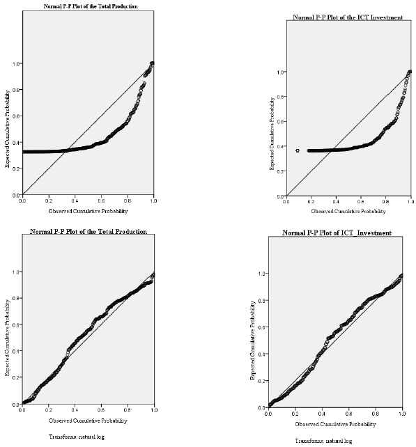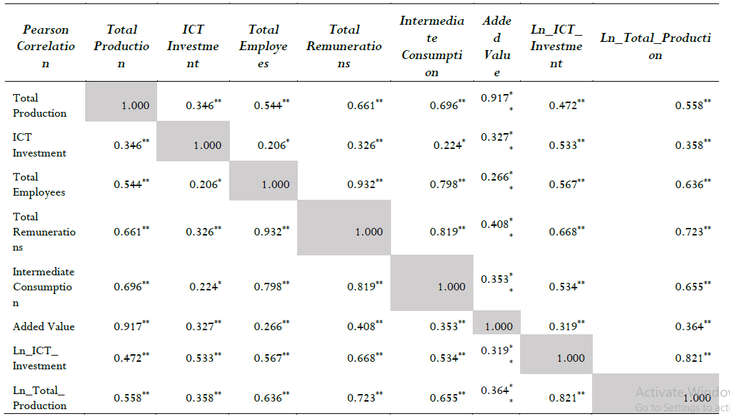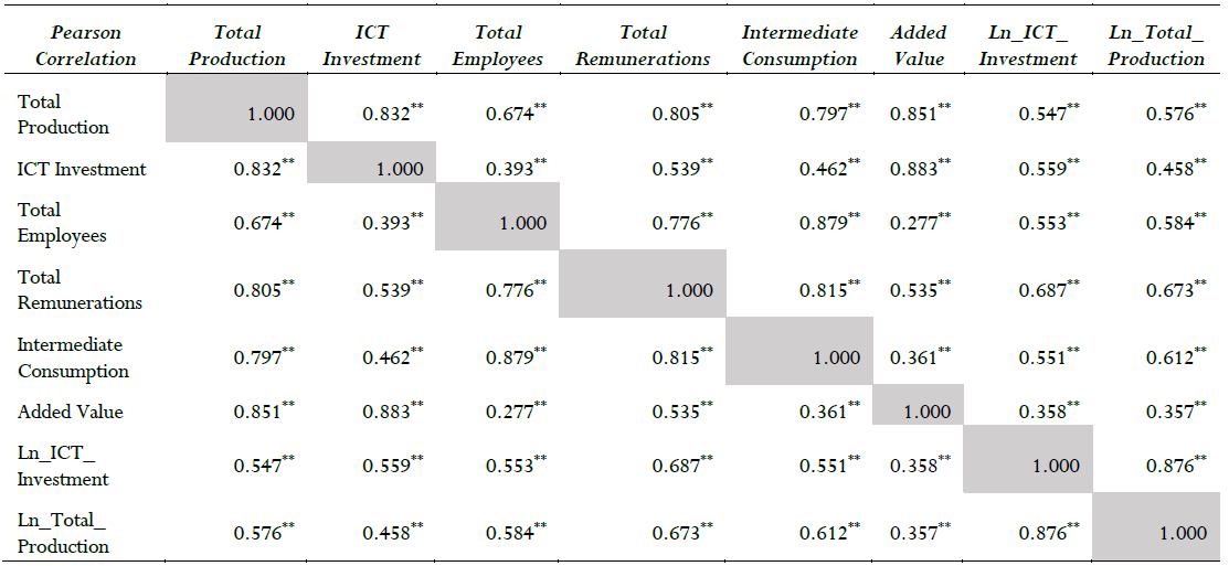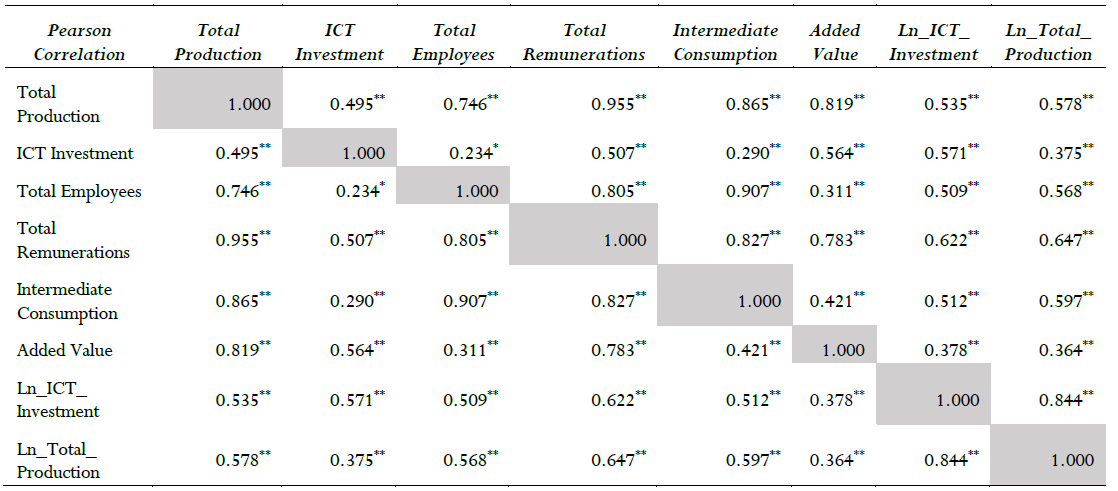 This study exclusively analyzes the relationship between the ICT investment and the total production. Thus, the correlation between Ln_ICT_Investment and all the variables is significant at least at 0.05 level. The highest correlation coefficient is presented between the Ln_ICT_Investment and Ln_Total_Production variable, while the lowest correlation coefficient is between Ln_ICT_Investment and added value. The correlation coefficients are summarized below (Table 8).