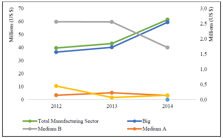 The investment in ICT in the manufacturing companies -refers to disbursements to buy physical devices, software or computer applications- was US$ 39.6 million during 2012. It increased in 54.9% until 2014 (US$ 61.4 million). The big companies show a similar trend compared to the total manufacturing firms, their ICT investment varies between US$ 36.5 million (2012) to US$ 59.4 million (2014). On the other hand, the ICT investment for medium A, medium B, and small firms decreased by 36.8% from US$ 3.1 million to US$ 1.9 million during 2012-2014. The highest reduction (-33.1%) in the ICT investment occurs in medium B firms, changing from US$ 2.5 million (2012) to US$ 1.7 million (2014) (Figure 2).