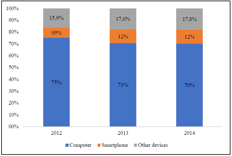 The number of devices used by manufacturing companies to develop their economic activities has been maintained during the studied period, varying by 1.1% (from 1,800 to 1,819 technological devices during 2012 and 2014, respectively). In 2014, 70.1% of the total possession of technological devices corresponds to computers, while 12.1% are smartphones and 17.8% represent other devices (grouped: PDA, tablet and other devices) (Figure 4).