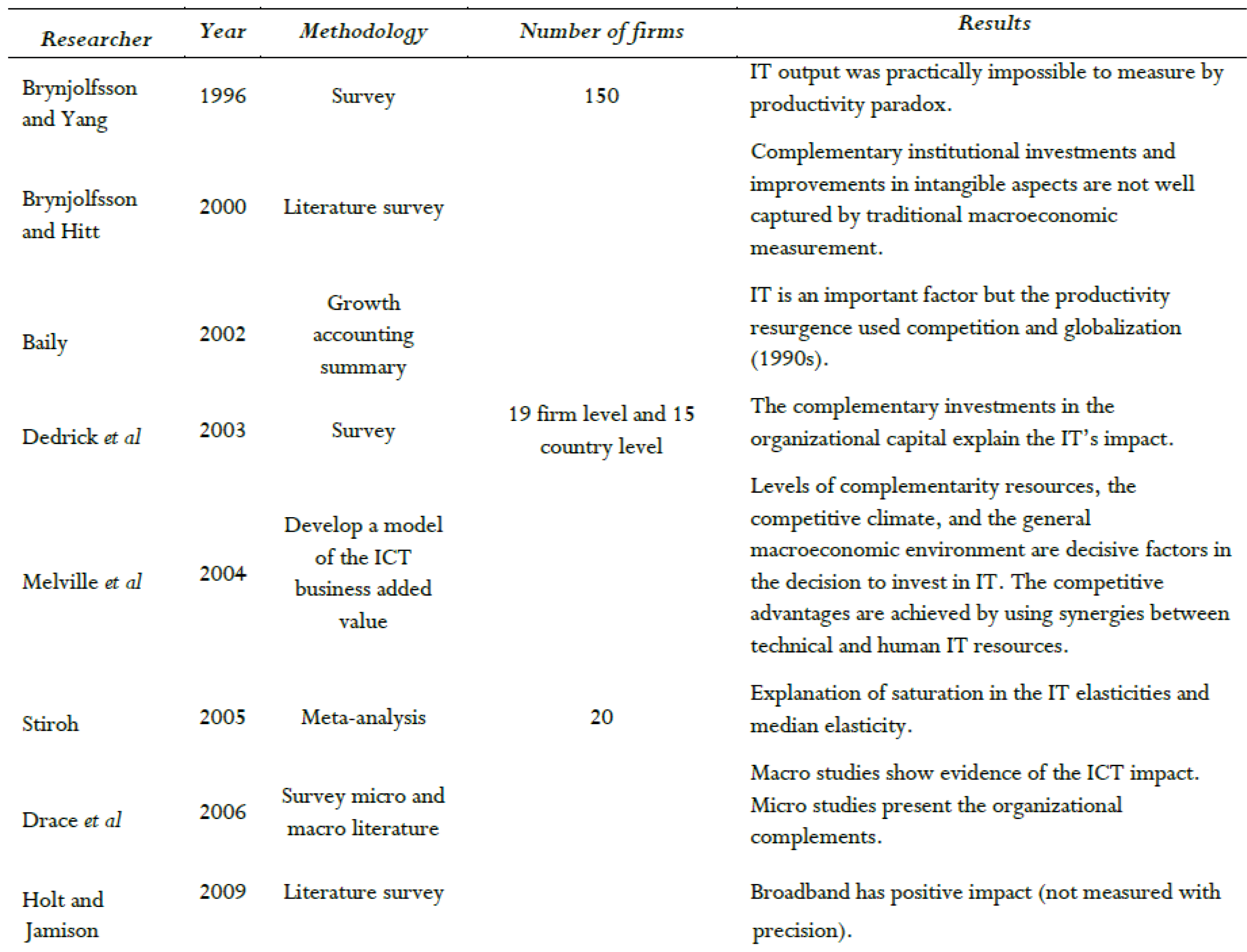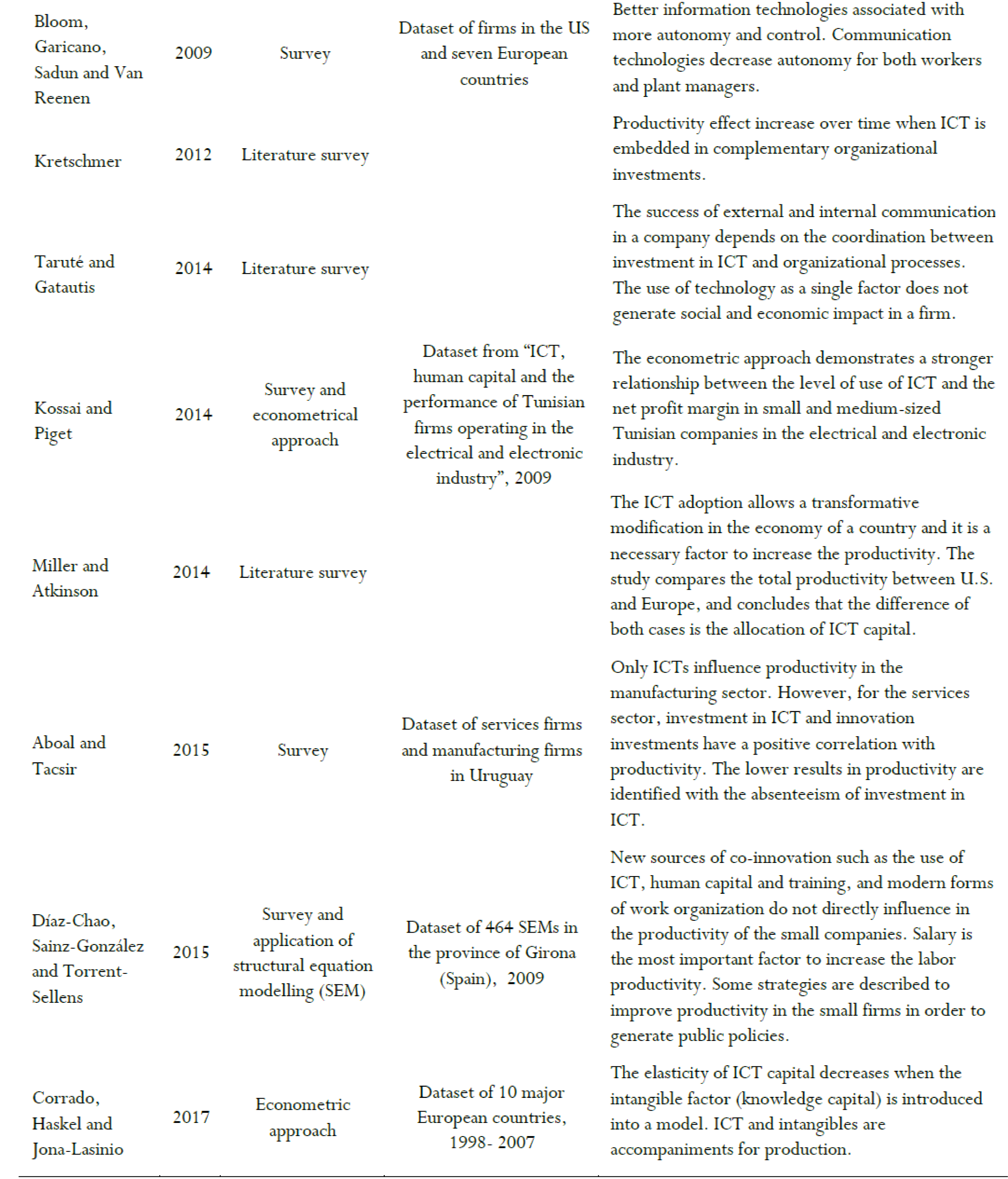Some previous studies as Bloom, Garicano, Sadun and Van Reenen (2009) show theoretically and empirically that ICT, conformed by information and communication components, has different effects on the employee empowerment and consequently on the wage inequality and reduction of the communication costs. Their study uses an original dataset of firms in the US and seven European countries. They concluded that better information technologies are associated with more autonomy and control. By contrast, communication technologies, including data networks, decrease autonomy of the human capital (workers and plant managers) in a company. Kretschmer (2015) gives an overview of the vast empirical literature on ICT and productivity. The empirical study demonstrates that the productivity effect is not only significant and positive, but also it increases over time when ICT is embedded in complementary organizational investments. The most important ICT studies are summarized in Table 1.
