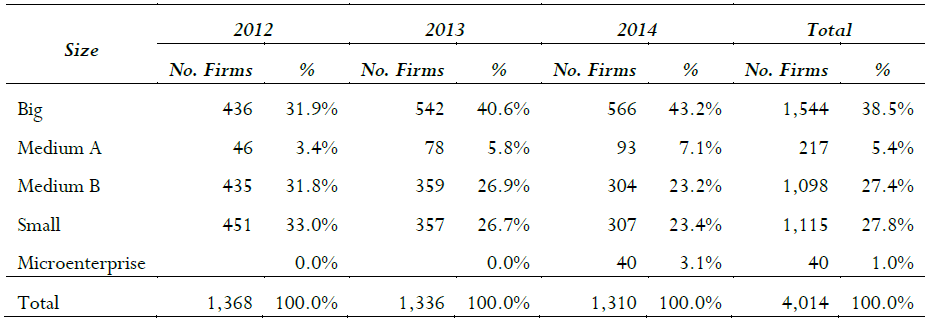 The category of big companies is the most representative during 2012-2014, its average contribution is 38.5% while the small companies symbolize 27.8%. The big, medium B and small firms represent on average 93.6% of the total sample during the analyzed period. The microenterprises do not record their information during 2012 and 2013 because the statistical sample is not representative of the study according to the Manufacturing, Mining, Internal Commerce and Services Survey (Table 3).