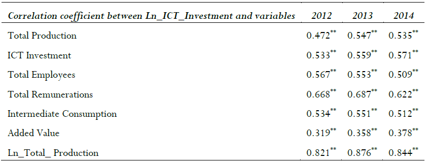 The results reflect a direct positive correlation between Ln_ICT_Investment and Ln_Total_Production in the manufacturing sector. The coefficients are significant at 0.05 level, being: 0.821 (2012), 0.876 (2013) and 0.844 (2014). For example, the relationship is positive at 84.4% in 2014, which means that one variable goes up or down as well as the other. The ICT investment (original variable) depends on the total production (original variable), and the highest relationship is presented in the year 2013.