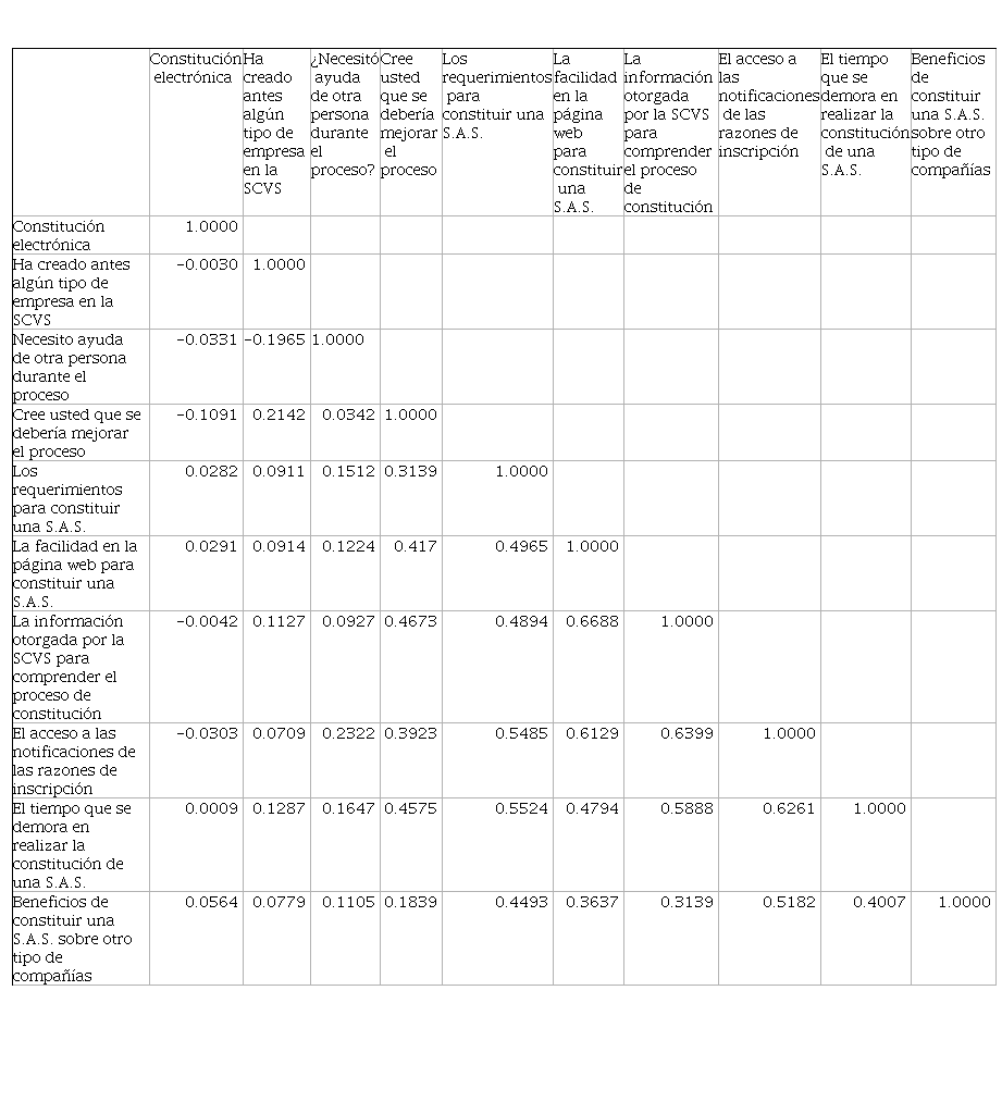 De igual forma tal como se mencionó anteriormente el tiempo de constitución jugaba un papel importante en la elección de las S.A.S. sobre los demás tipos societarios. Justamente en la Tabla 2 se encontró correlaciones positivas con más de 1 variable entre las más importantes tenemos que el nivel de satisfacción entre el tiempo que se demora en realizar la constitución de una S.A.S. esta positivamente correlacionada con el acceso a las notificaciones de las razones de inscripción con un 0.6261 y de igual forma con la variable información otorgada por la SCVS para comprender el proceso de constitución con un 0.588. Pero quizás la más importante es la correlación positiva que mantiene el tiempo de constitución de la S.A.S. con la variable beneficios de constituir una S.A.S. sobre otro tipo de compañías llegando a un 0.4007. Esta tabla reafirma la importancia de una buena página web la cual se puede ver reflejada con la correlación positiva que mantiene: La facilidad en la página web para constituir una S.A.S. con la variable Los requerimientos para constituir una S.A.S., con un 0.4965, es decir que al ser un proceso simplificado la constitución de una S.A.S. es de gran importancia que la navegación sea amigable con los usuarios durante todo el proceso.