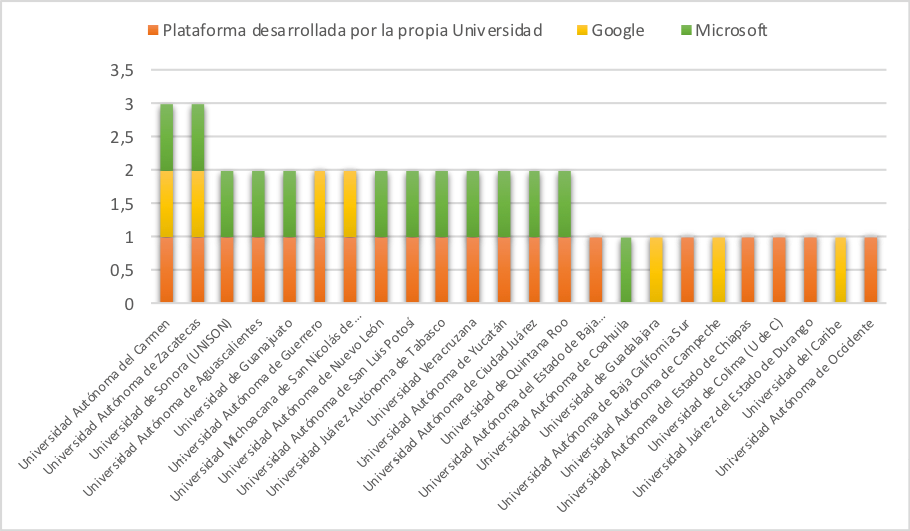Las plataformas que predominan son las administradas por la propia universidad, Google y Microsoft. El gráfico 1 da cuenta de dicha información: