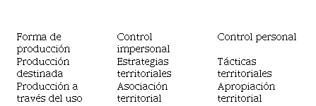 Las diferentes formas de producción territorial se usan para representar una manera de describir la complejidad territorial de un lugar, entendida esta como la ocurrencia de diferentes producciones territoriales que operan en un mismo lugar, pero en diferentes momentos o desde diferentes aspectos del lugar. El enfoque se centra entonces en los aspectos activos y operativos del control territorial, así como las diferentes formas de producción territorial pueden estar operando en el mismo lugar, movilizando diferentes grupos de objetos, reglas, etc.