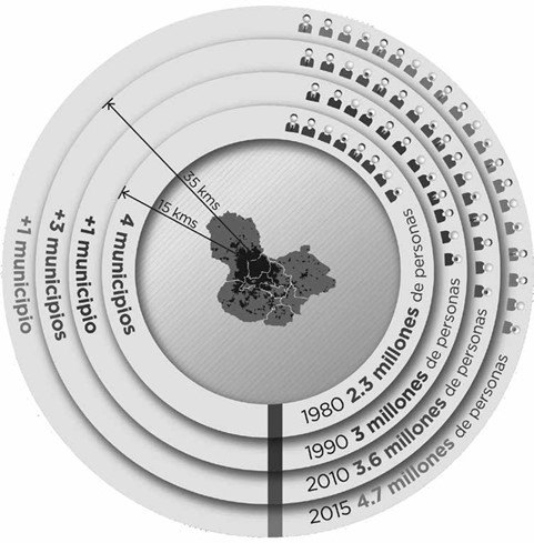Evidencia de lo anterior es que en estos últimos 30 años la población se duplicó, mientras que las manchas urbanas se expandieron cuatro veces (IMEPLAN, 2015, p. 20), de manera desmedida y desordenada, siendo así que para el año 2009, el número de municipios reconocidos como parte del Área Metropolitana de Guadalajara1 ascendía a ocho y para 2015, era de nueve municipios. Aunque tres de éstos no tienen plena conurbación física, se decretó que serían tratados como metropolitanos por política urbana y para la planificación urbano-regional de los ahora 35 kilómetros concéntricos del territorio de la ciudad (Osorio, 2014, p. 48).