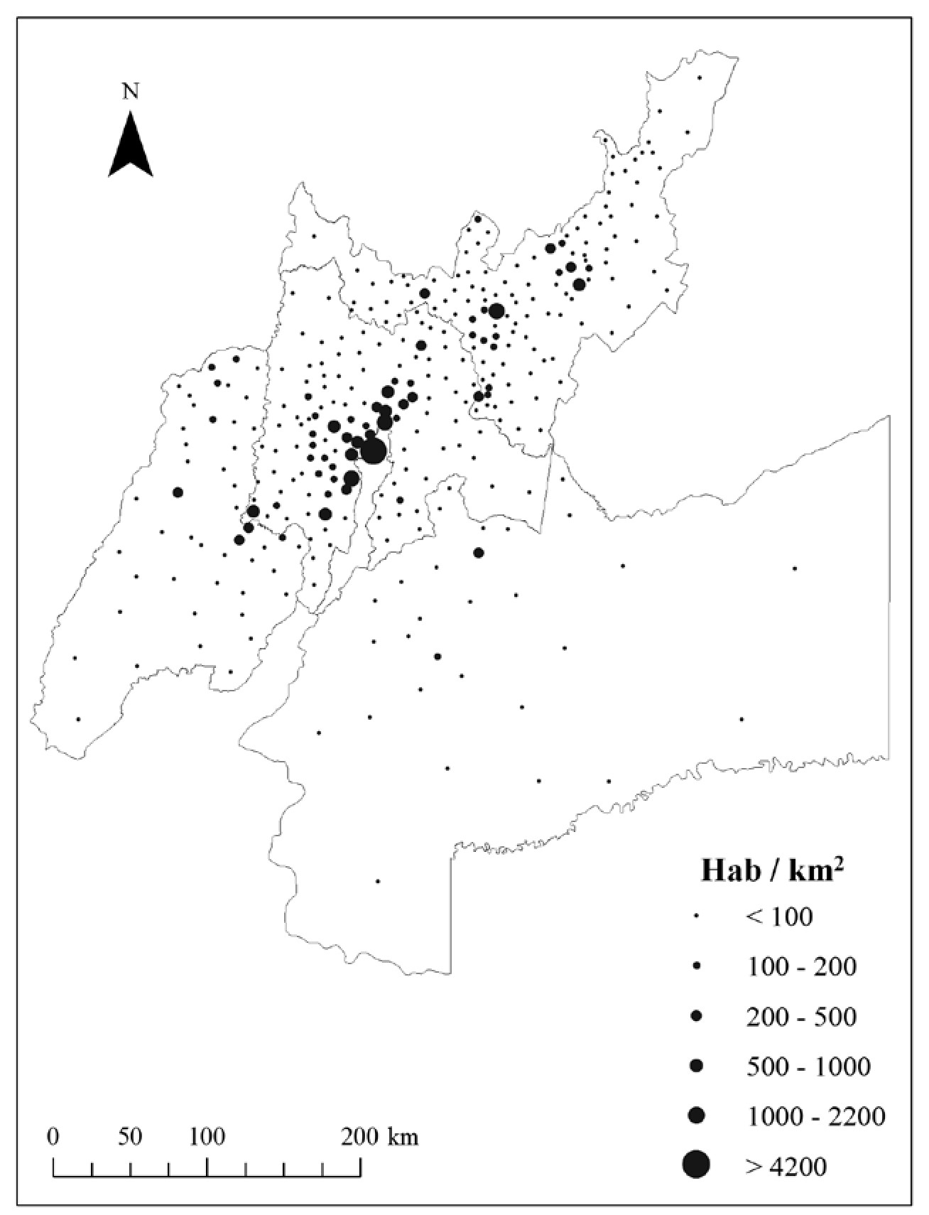 El sistema de ciudades de la RAPE-RC está conformado por los departamentos de Boyacá (123 municipios), Cundinamarca (116 municipios), Tolima (47 municipios) Meta (29 municipios) y el Distrito Capital de Bogotá, que en total abarcan 316 municipios, con una extensión de 156.605 km2, que representa el 13,7% de la superficie del país (Alcaldía Mayor de Bogotá et al., 2014, p. 6). De acuerdo con el censo general 2005 (DANE, 2008, p. 29-72), cuenta con una población total de 12.523.974 habitantes, donde el 84% de esta habita en la cabecera de los municipios. La concentración de población se da al interior de la región, específicamente en la ciudad de Bogotá, donde se encuentran 4.200 hab/km2, contrastando con el departamento del Meta, en el cual la densidad de población es inferior a 1 hab/km2 en gran parte del territorio (Figura 1).
