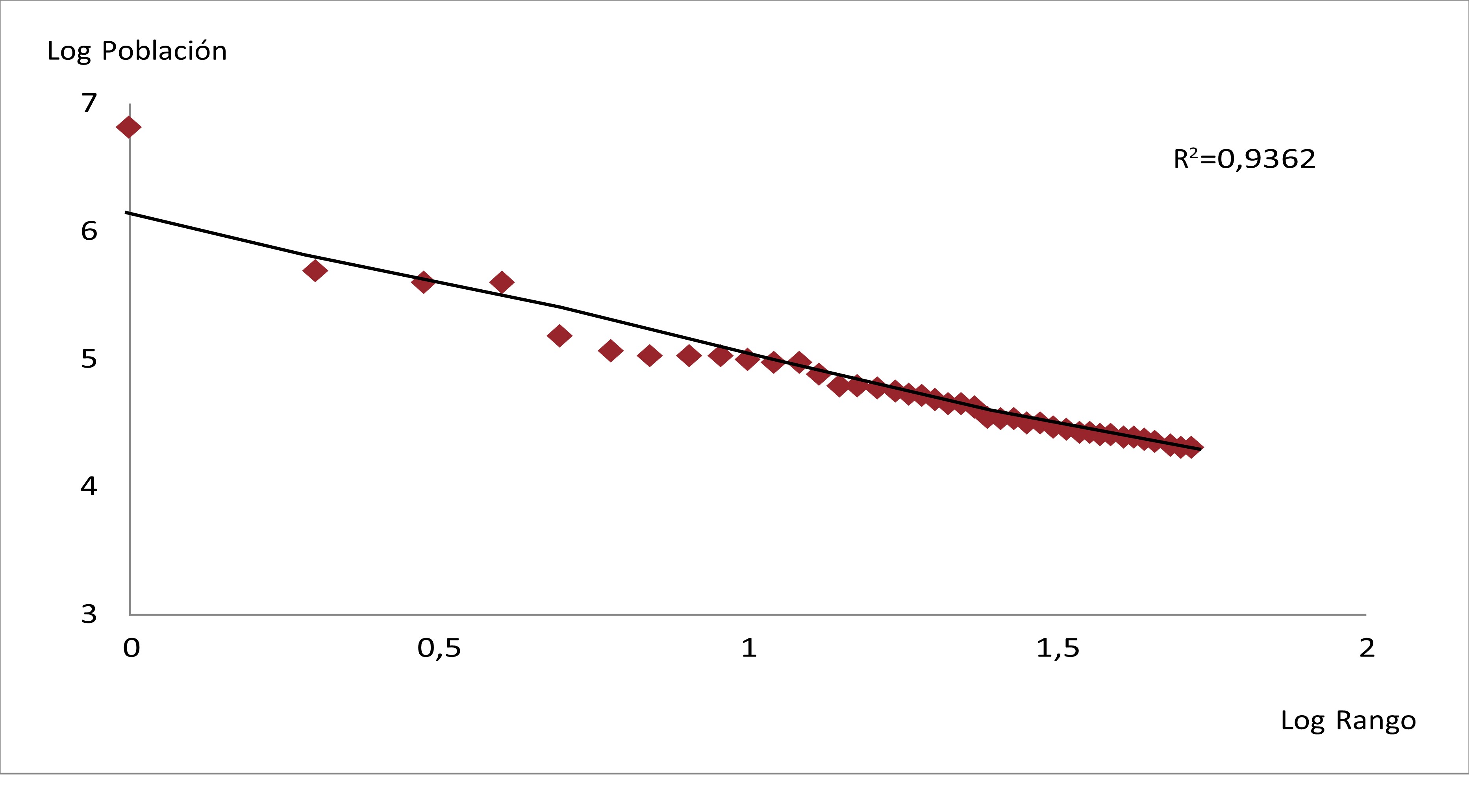 La jerarquía urbana de la RAPE–RC, según el índice rango–tamaño, presenta una distribución vertical desequilibrada (Figura 2), que coloca al Distrito Capital en un primer nivel donde se proyecta que, para el año 2020, su densidad poblacional será de 5.281 habitantes hab/km2 (DANE, 2010). En un segundo nivel se ubican las capitales de los departamentos de Tolima (Ibagué) y Meta (Villavicencio), así como un municipio de Cundinamarca que se encuentra conurbado con Bogotá (Soacha), los cuales presentan una cantidad de habitantes 16 veces menor respecto a la del Distrito Capital. El tercer nivel lo conforman seis municipios: Tunja, Sogamoso, Fusagasugá, Facatativá, Duitama y Zipaquirá, que tienen una población 59 veces menor que aquella que se concentra en Bogotá. En estos municipios, pertenecientes a los departamentos de Boyacá y Cundinamarca, resalta la presencia de Tunja, capital de Boyacá. Finalmente, existe un último nivel, con 306 municipios, que en conjunto tienen una población inferior a los 99.000 habitantes. Esta distribución desequilibrada se explica por la concentración de población existente en el Distrito Capital, con el 55% del total de habitantes agrupado en menos del 1% del total del territorio.
