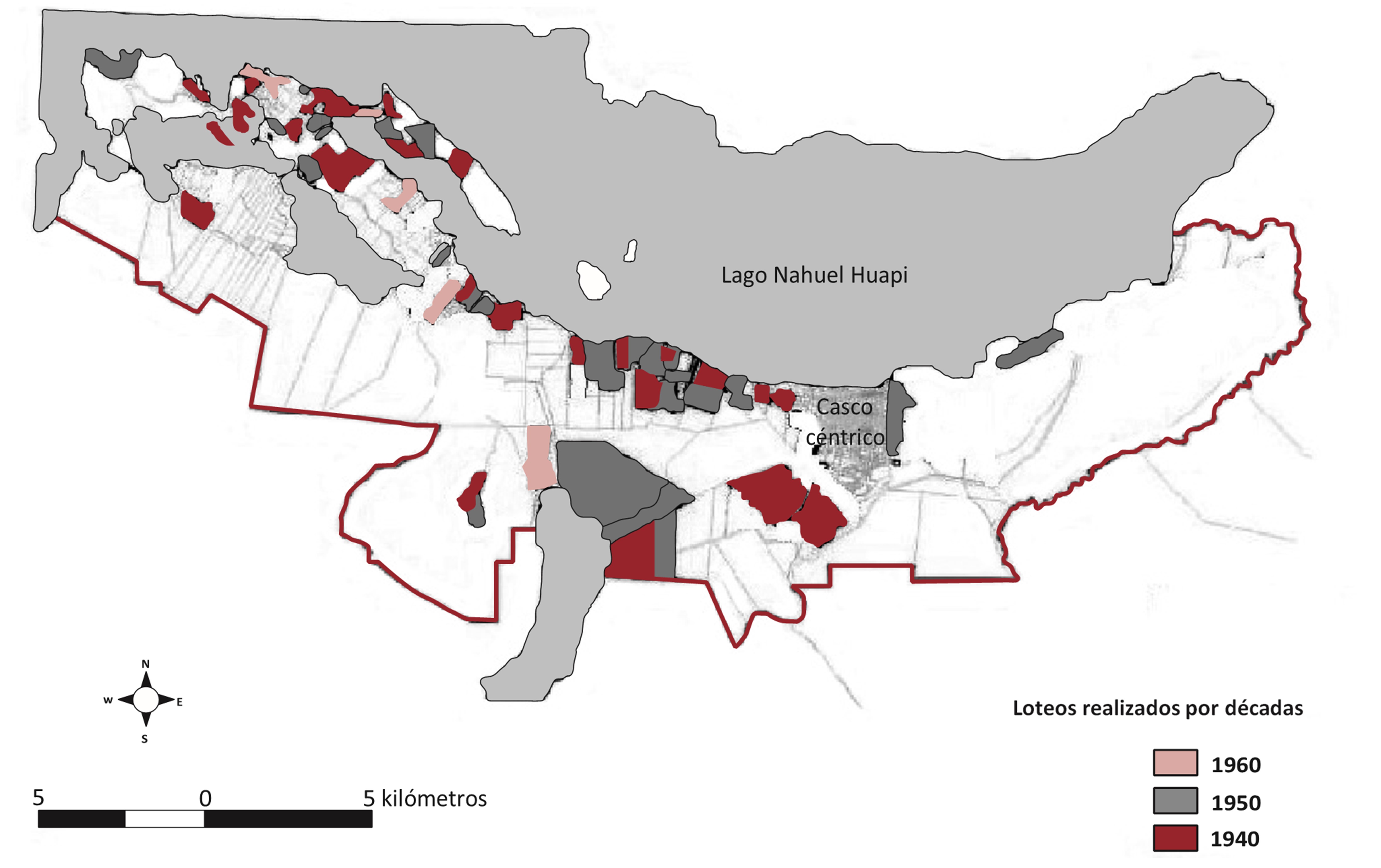 Durante este proceso, el ejido de la ciudad no solo continuó expandiéndose y absorbiendo muchas de las tierras que habían pertenecido a Parques Nacionales —sobre todo luego de la provincialización de Río Negro en 1955—, sino que paralelamente las áreas loteadas también pasaron a formar parte de su jurisdicción (figura 2.).