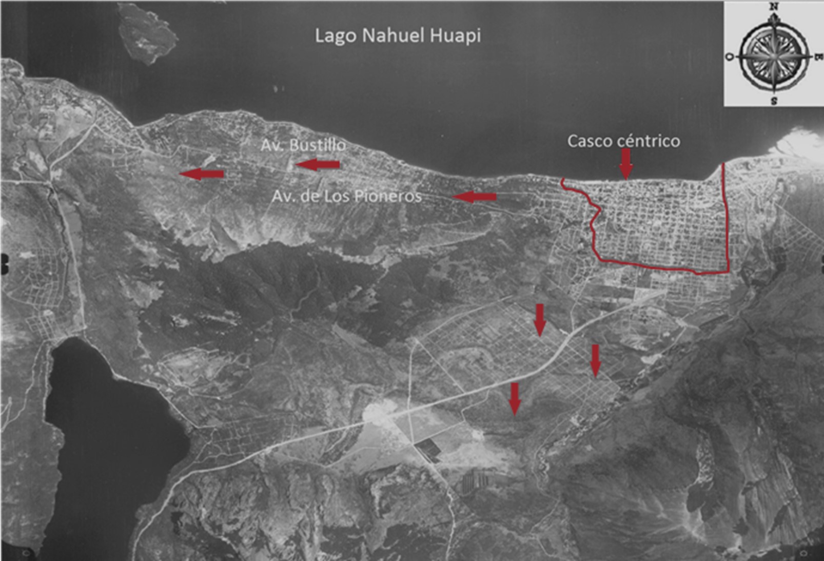 Unos años antes de la aprobación del Plan director de 1979 y los primeros códigos de planeamiento y de edificación, el crecimiento difuso y orientado hacia los principales atractivos turísticos y paisajísticos empezaba a sellar sus trazos urbanos y, con ello, sus consecuencias críticas. Ya a mediados de la década de 1970, se distinguían dos tipos de manifestaciones socio espaciales contrastantes: hacia el oeste y sobre la costa del lago Nahuel Huapi se localizaban las residencias de grupos sociales acomodados provenientes, sobre todo, de Buenos Aires, mientras que en el sur, en terrenos que carecían de la vista al lago por su elevada pendiente, residían en viviendas precarias los grupos de menores recursos (Vapñarsky, 1983).