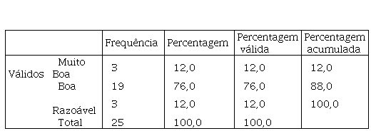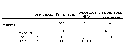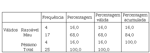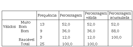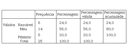 Esta tabela 25, representa o indicador salário, observa-se que a amostra respondeu maioritariamente (64%) que o salário que auferem é razoável, enquanto 20% considera bom e outros 16% considera mau. Estes dados indicam-nos que maior parte dos inqueridos considera que o salário que aufere é razoável. Este último indicar a semelhança dos três últimos, concorrem para elevar a auto-estima e a motivação dos funcionários. A sua ausência ou insuficiência, em grande ou pequena medida, implica automaticamente a redução da motivação pelo trabalho que exercem.