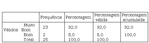 Na tabela a seguir (21), onde se analisa o relacionamento entre colegas, observa-se que 92% da amostra considera este indicador como sendo muito bom, enquanto 8% considera bom. Estes dados indicam-nos que maior parte dos inqueridos considera que o relacionamento entre colegas é satisfatório.