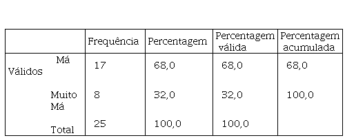 Na tabela 24, observa-se que a amostra respondeu maioritariamente (68%) que a recompensa no departamento é má, enquanto 32% considera muito má. Estes dados nos indicam que maior parte dos inqueridos consideram que a recompensa dentro do departamento é má.