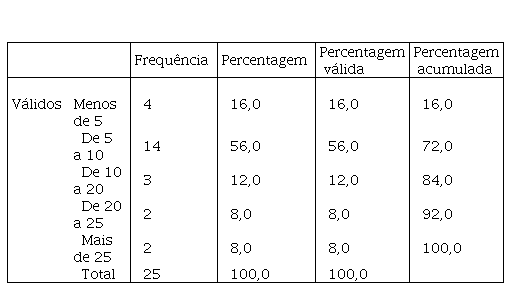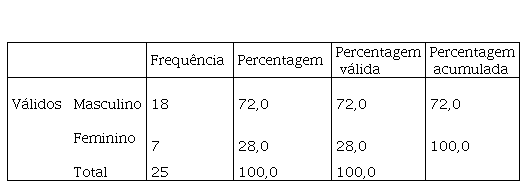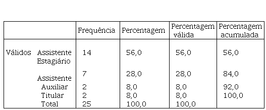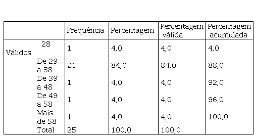 Na tabela acima, nota-se uma clara tendência para uma população mais jovem, dado que 21 docentes, o que corresponde a 84% da amostra, têm idades que compreendem ao intervalo de 29 a 38 anos respectivamente, sendo esta faixa etária mais representativa da amostra.