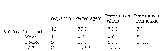 A tabela acima representa a caracterização da amostra por habilitação literária. Pode-se verificar que 76% da amostra é licenciado, 4% mestre e os restantes 20% Doutor.