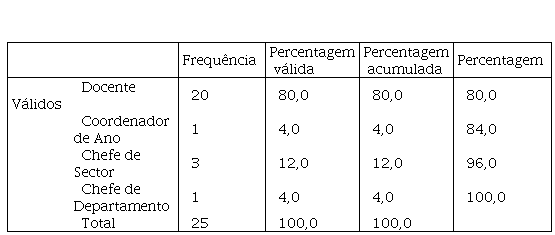 Observa-se na tabela acima, que dos 25 docentes inqueridos no Departamento de Ciências Exactas, 20 são simplesmente professores, 3 são chefes de sector, 1 é coordenador de ano e, finalmente, 1 chefe de Departamento.