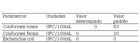 De acordo ao Decreto Presidencial nº 261/11, de 6 de Outubro, considera-se que determinada água é apropriada para o consumo sempre que os valores determinados para os parâmetros em estudo forem iguais ou inferiores aos valores padrão. Para a análise da qualidade da água para o consumo humano, no presente estudo, tiveram-se em conta os parâmetros coliformes totais, coliformes fecais e Escherichia coli, cujos valores padrão são 50 UFC/100mL, 20 UFC/100mL e 0 UFC/100mL respectivamente.