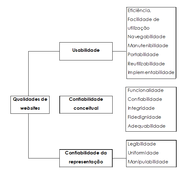 Segundo Moraes e Werneck (2003), a qualidade de software é uma combinação complexa de fatores que variam de acordo com diferentes aplicações e clientes que as solicitam. Estes autores definiram um conjunto de atributos de qualidade adequados a aplicações web que abrangem aspetos referentes ao uso da tecnologia e ao conteúdo disponibilizado. As principais características são divididas em: usabilidade, confiabilidade conceitual e confiabilidade da representação. Cada uma delas tem sub-caraterísticas que contêm atributos de qualidade, conforme a Figura 1: