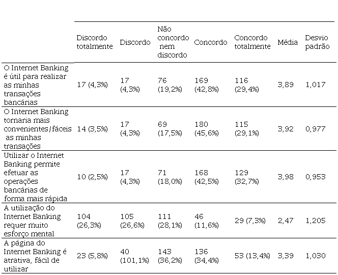 As últimas colunas da Tabela 1 apresentam também a média e o desvio-padrão (recorde-se que: discordo totalmente = 1 e Concordo totalmente = 5). Como se pode observar, em duas afirmações regista-se uma menor dispersão de respostas: “o Internet Banking tornaria mais fáceis as minhas transações” e “ o Internet Banking permite operações bancárias mais rápidas”, ao passo que a afirmação “a utilização do Internet Banking requer esforço mental ” gera respostas mais díspares.