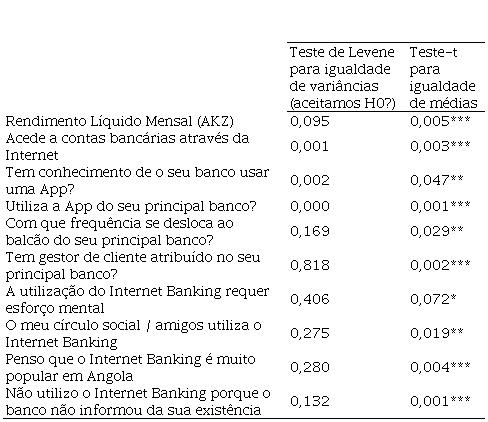 A Tabela 4 apresenta apenas os resultados significativos dos testes de igualdade de variâncias (Teste de Levene) e do correspondente teste t para igualdade de médias, realizados a um conjunto de 31 variáveis. Pela análise dos resultados conclui-se que, por um lado, na maioria dos casos é aceite a hipótese nula de igualdade de variâncias e, por outro lado, os testes de igualdade de médias adequado em função do teste de Levene aponta para um pequeno conjunto de casos (10) de diferenças significativas nas respostas dadas, salientando-se os seguintes: i) diferenças claras dos níveis de rendimento dos respondentes em função do seu género (mulheres ganham menos); ii) em relação ao género, diferenças significativas em relação às questões associadas à “acesso a contas bancárias através da Internet” (por exemplo, as mulheres utilizam mais), “utilização da App do banco”, “tem gestor de cliente atribuído”, “a utilização do Internet Banking requer esforço mental” (mulheres concordam mais), “penso que o Internet Banking é muito popular em Angola” (mulheres concordam mais) e “não utilizo o Internet Banking porque o banco não informou da sua existência” (mulheres concordam mais).