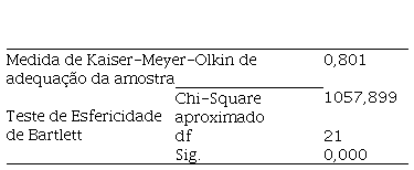 Podemos consultar na Tabela 5 o valor de KMO (0,801) que, de acordo com Pestana e Gageiro (2014), indica uma ótima Análise Fatorial, uma vez que o teste de Bartlett tem associado um nível de significância de 0,000 e leva-nos à rejeição da hipótese da matriz das correlações na população ser a matriz identidade, mostrando assim que a correlação entre algumas variáveis é estatisticamente significativa.