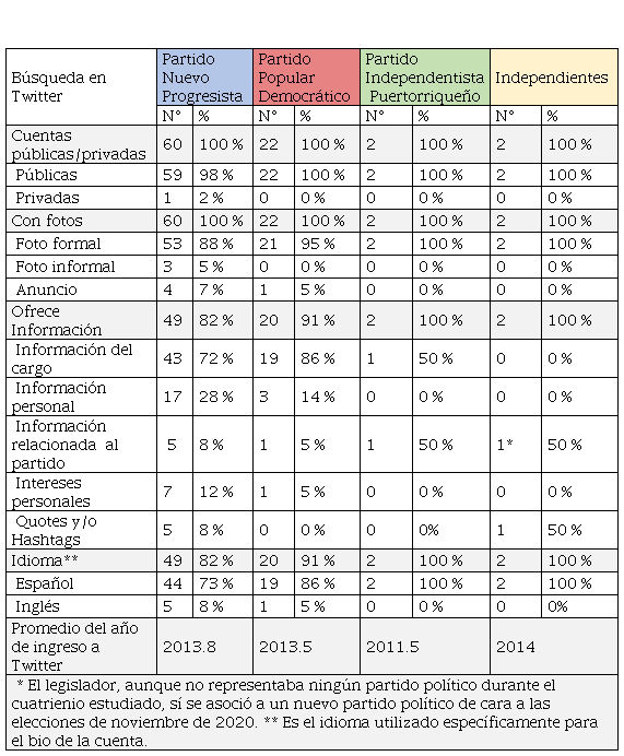 La Asamblea Legislativa de Puerto Rico cuenta con 80 senadores y representantes, de los que 78 (98 %) están presentes en Twitter. Aunque se constataron 86 cuentas, es decir, 8 más que los legisladores presentes en la red, esto responde al hecho de que hay 8 legisladores con dos o más cuentas. El patrón indica que se deja en desuso la cuenta más antigua y entra en uso la más nueva (tabla 1).