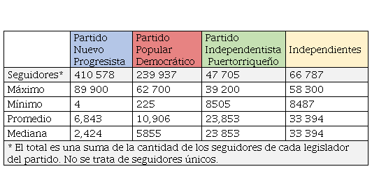 Las cuentas de los legisladores en general resultan exitosas siendo la media de seguidores por legislador más de 8 mil. Aunque el partido con mayor cantidad de legisladores durante el periodo de muestra posee la cuenta con el máximo mayor de seguidores, también posee el mínimo más bajo. Cabe recalcar, sin embargo, que los legisladores de minoría —PIP e independientes— resultan mucho más favorecidos en promedio de seguidores.