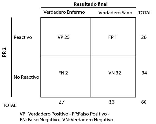 La PR1 detectó 27/27 muestras reactivas que corresponden al 100% de resultados reactivos en el grupo de verdaderos enfermos. Sensibilidad de 100% para las 60 muestras (Tabla 1).