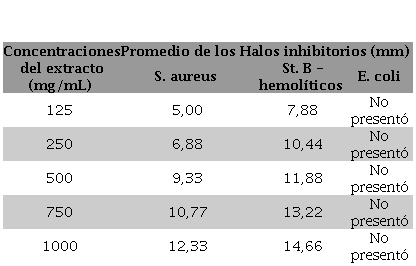 Resultados: el extracto inhibió el crecimiento in vitro de Staphylococcus aureus y Streptococcus B-hemolíticos. La mayor inhibición se observó a 1 000 mg/ml con halos inhibitorios de 14,6 mm y 12,33 mm de diámetro, respectivamente. Para Escherichia coli no se observó la formación de halos inhibitorios. Las cepas de Streptococcus B-hemolíticos y Staphylococcus aureus presentaron una concentración mínima inhibitoria de 250 y 500 mg/ml, respectivamente.