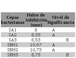El Análisis de Varianza (ANOVA) evidenció diferencias significativas entre la inhibición de S. aureus y St. B-hemolíticos respecto a las concentraciones evaluadas (Tabla 2).