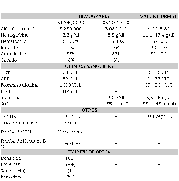 Laboratorios de fecha 31 de mayo de 2020 y 03 de junio de 2020, se describen los datos alterados, los demás datos se encuentran dentro del valor de referencia. Ver tabla 1.