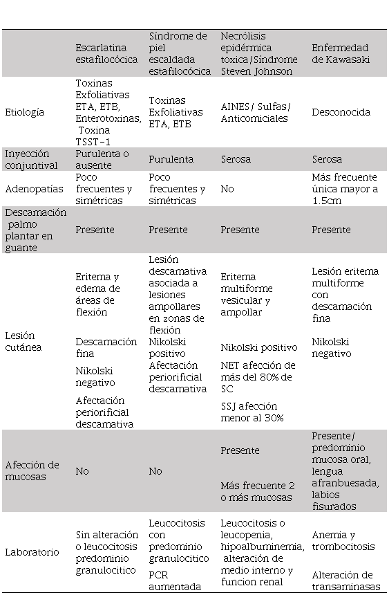 En la tabla 1 se detallan las principales diferencias entre la Enfermedad de Kawasaki, la NET, el SEPE y la EE.