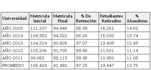 El abandono escolar es un problema para las universidades y que abarca varios aspectos de la misma como son el deterioro de los índices de la eficiencia terminal, índices de calidad institucional y pérdida de egresos por falta de pagos de aranceles. Según el Consejo Nacional de Universidades (CNU) en su informe de Rendición Social de Cuentas (2015 y 2016).