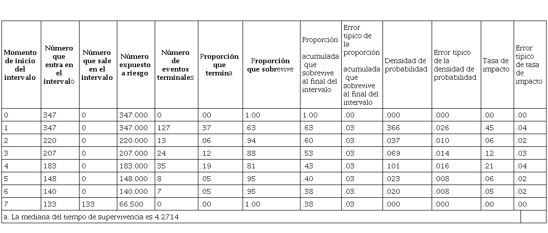 Los métodos de supervivencia usados en este estudio fueron: tablas de mortalidad, procedimiento Kaplan-Meier y la Regresión de Cox.