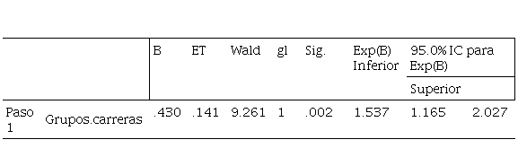 Luego de este paso quedaron las variables sexo y procedencia fuera de la ecuación. Otro valor importante a tomar en cuente en la tabla anterior es el valor Exp(B) el cual significa que un estudiante que pertenece a las carreras de Zootecnia, Informática y Agroforestal tiene 53.75% más probabilidad de abandonar sus carreras que los otros.