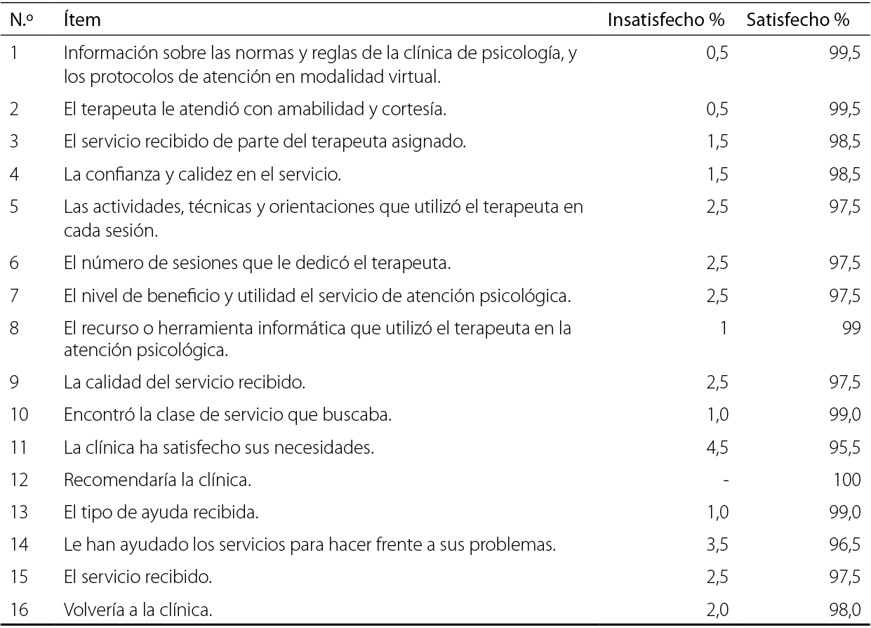 Los resultados más relevantes fueron los siguientes: todos los pacientes coincidieron en que el terapeuta asignado les atendió cortésmente, el 86 % valoró la ayuda brindada por el terapeuta, el 76 % afirmó que las técnicas utilizadas en las sesiones resultaron efectivas, el 81 % evaluó excelente la utilidad del servicio de atención psicológica, así como la calidad del servicio psicológico recibido. Mientras que el 85 % indicó que la clínica satisfizo sus necesidades y el 90 % recomendaría la clínica a un amigo si necesitará ayuda psicológica. El 95 % consideró que sí, o probablemente sí, volverían a la clínica en busca de ayuda23.