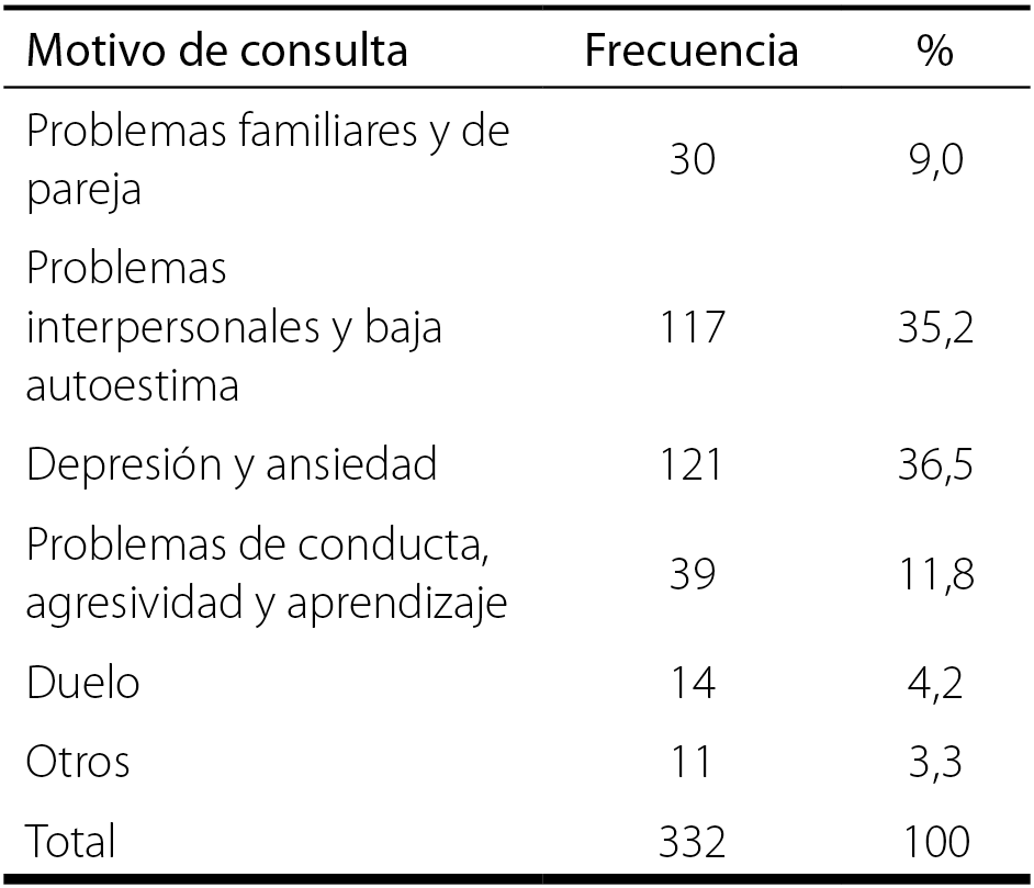 Como primer punto, se muestran los motivos de consulta atendidos en la Clínica de Psicología de la UTEC (Tabla 3), donde se observó la depresión y la ansiedad como el motivo frecuente, seguido de los problemas interpersonales y la baja autoestima, de un total de 332 pacientes que solicitaron la atención psicológica.