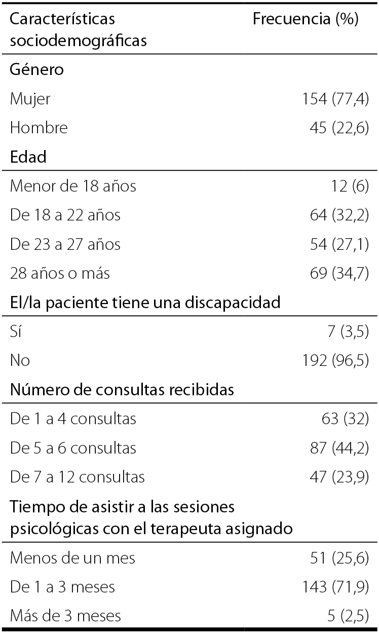 En un primer punto, se describen las variables sociodemográficas de los pacientes evaluados. La mayor parte de los participantes fueron mujeres (77,1 %). La media de edad general fue de 26,52 años, con una desviación estándar de 8,93. Con respecto a la media de edad en función del género, de las mujeres fue de 26,93 años, con una desviación estándar de 9,28; la de hombres, de 25,13 años con una desviación estándar de 7,56. La discapacidad se identificó en el 3,5 % de los participantes. En relación al número de consulta, el 68 % habían recibido más de 5 consultas y más del 70 % de los participantes tenían entre 1 y 3 meses de asistir a las sesiones psicológicas. En la Tabla 2 se muestran las características sociodemográficas de los pacientes del presente estudio.