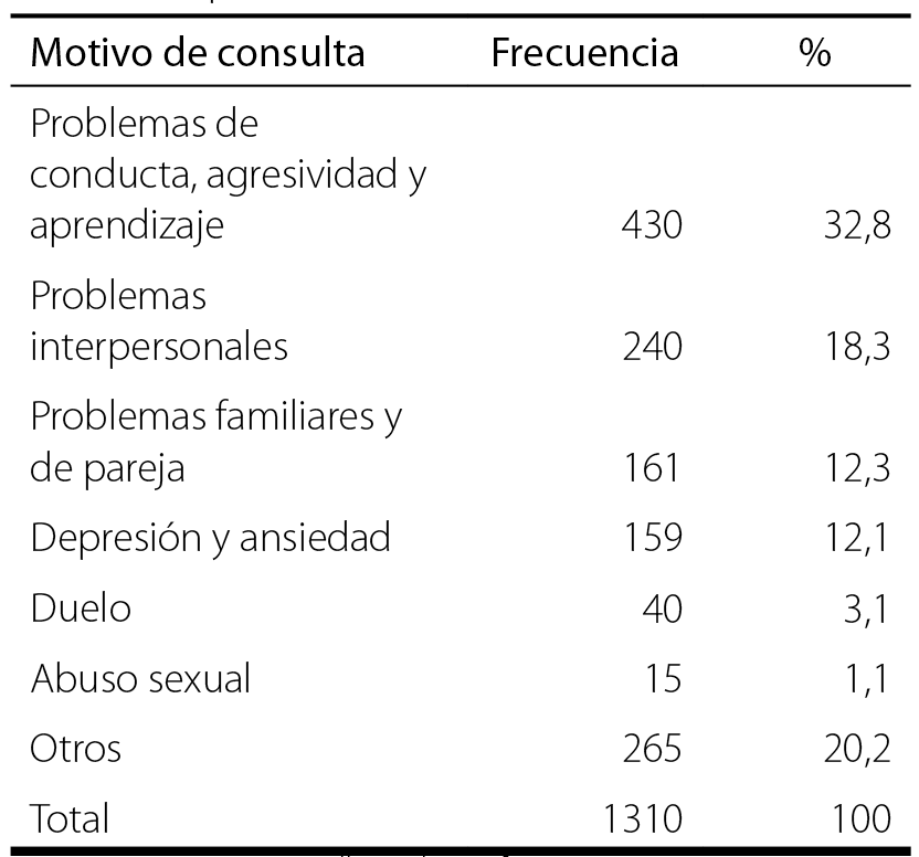 La clínica de psicología de la UTEC realizó un estudio23 durante los ciclos 01 y 02 del año 2014 con el objetivo de evaluar la satisfacción con el servicio brindado. En esta investigación, los autores reportaron los motivos de consulta atendidos desde el año 2009 hasta el 2013 (Tabla 1). En este periodo los motivos de consulta que mayormente se atendieron fueron problemas de conducta, agresividad, aprendizaje y problemas interpersonales (autoestima); posteriormente, detallan que se evaluó una muestra de 42 pacientes, de los cuales 51,8 % fueron del género femenino y 48,2 % masculino.